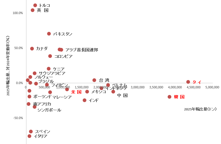 - 2025年輸出量(トン)を横軸、2025年輸出量の対2024年変動率(%)を縦軸とした散布図でみると、タイ、韓国向けは、輸出量は多いが、成長率はあまり高くない。