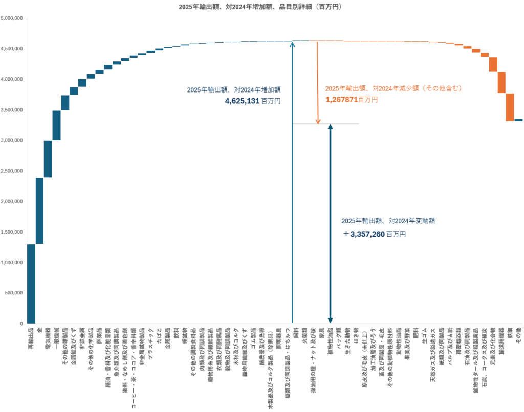 2024年から2025年の輸出額の変動額を品目別に増加と減少で区別してみると、増加合計は4兆6,251億円、減少合計は1兆2,679億円で、それらの差として変動額が3兆3,573億円増加となっている。