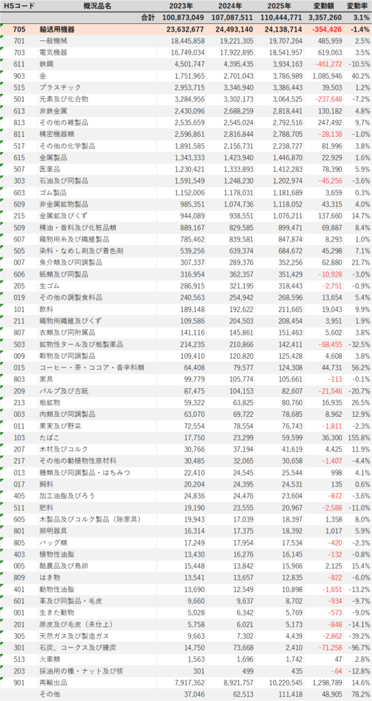 2025年の日本からの輸出額の内訳を品目別(HSコード3桁分類)でみてみた。