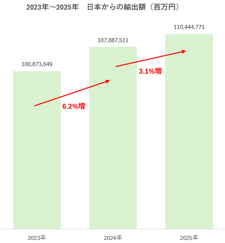 2025年の日本からの輸出額合計は110.4兆円で、2024年の107.1兆円から3兆3,573億円(3.1%)増加している。