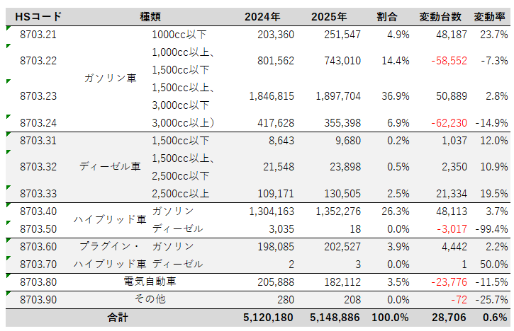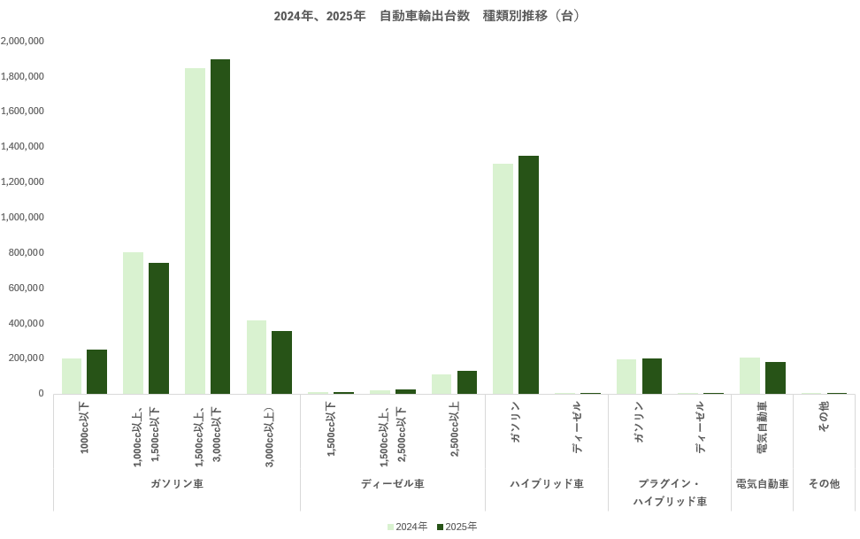 - ガソリン車(1,500cc以上、3,000cc以下)輸出台数:189.9万台、2024年から2.8%増