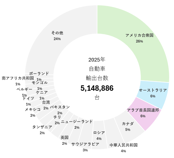 - 2025年輸出台数は515万台で、2024年の512万台から0.6%微増(ノックダウン、新車、中古の総計であることに注意)