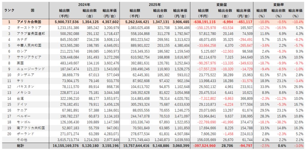 - 中古も入った数字なので、改めて新車のみでの分析も必要であるが、アメリカ向け輸出は、台数はほぼ横ばいにもかかわらず、輸出額が10.8%減少したことから単価が、そのまま下がっており、関税分を吸収し、台数を守ったことがみてとれる。