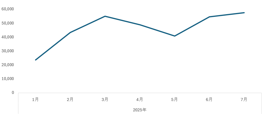 2025年7月の輸出量は57,526トンで、6月の54,623トンから5.3%増加している。2025年1月~7月の月次平均変動率は16%で変動を繰り返しながらも増加している。