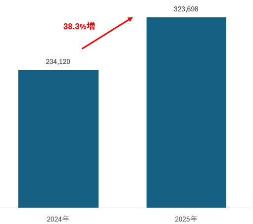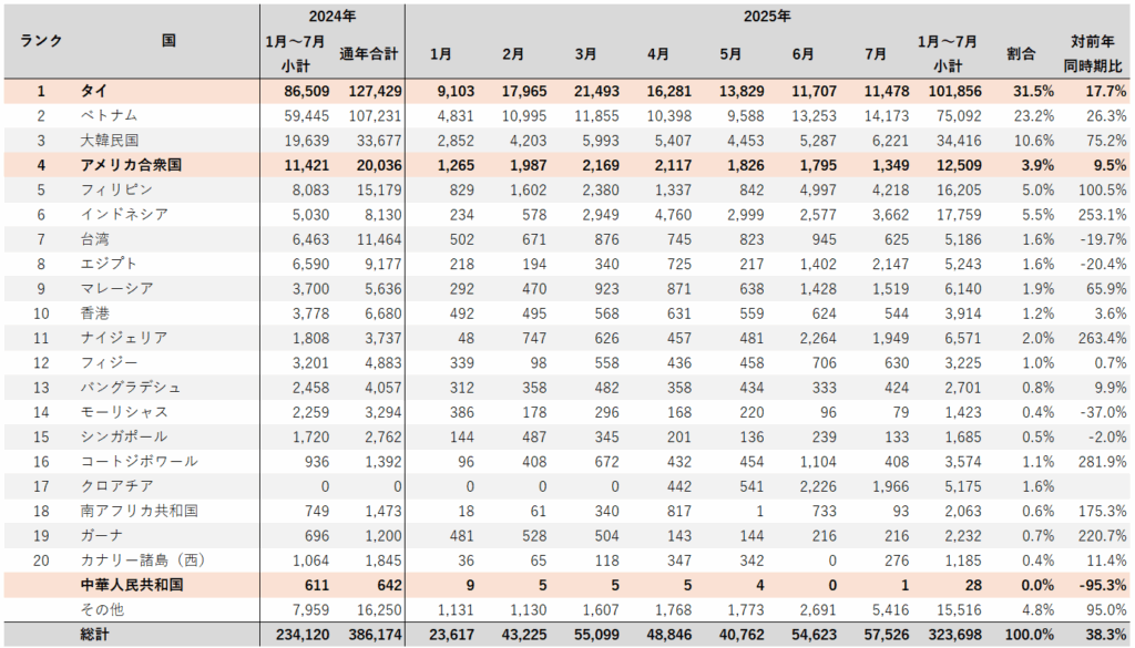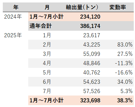 1月~7月小計でみると、2024年は234,120トンであったのが、2025年には323,698トンと38.3%増加している。