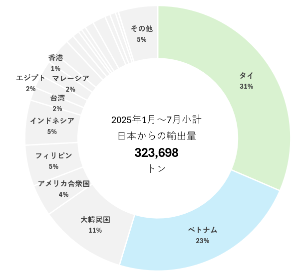 次に、2025年1月~7月小計において輸出先を国別にみてみると、タイ向けが101.856トン(31%)でトップ、次に、ベトナム向けの75,092トン(23%)、そして、韓国向け34,416トン(11%)。上位2ケ国のタイとベトナム向けで全体の54%を占めている。