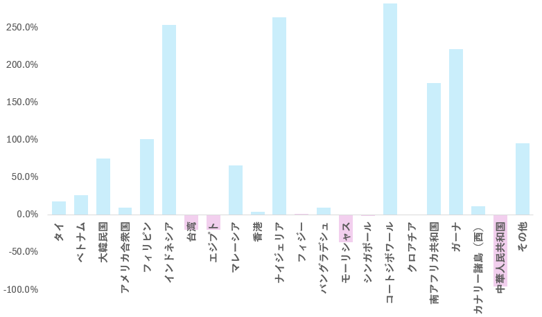 2025年1月~7月小計輸出量を2024年同時期と比較してみると、全体では38.3%の増加。国別では、コートジボワール向けが282%、ナイジェリア向けが263%、インドネシア向けが253%と大幅に増加している。一方、アメリカ向けは9.5%の微増にとどまり、中国向けは、95.3%の減少となっている。今後、中国向け輸出がどこまで回復していくが大きなキーとなってくる。