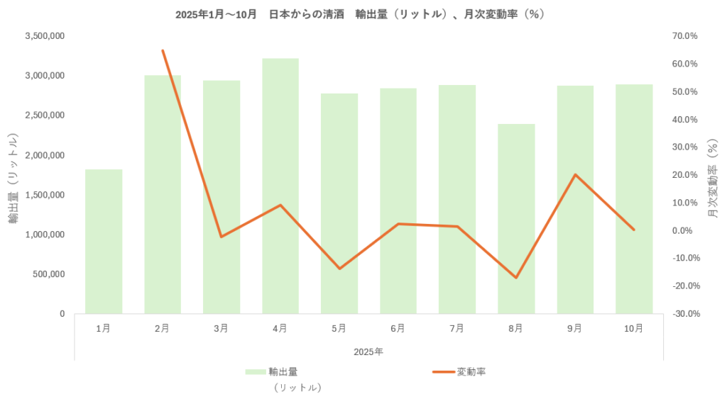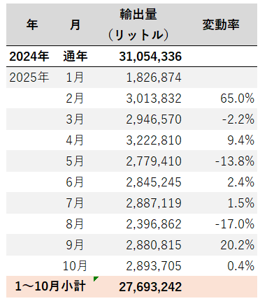 2025年10月の輸出量は289万リットルで、9月の288万リットルから0.4%増加している。2025年1月~10月の月次でみると、1月~2月に65%と大幅に増加した後、290万リットル前後で横ばい状況。