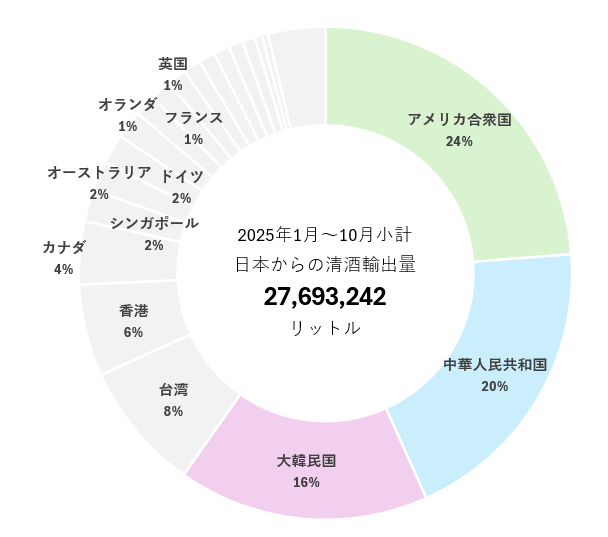 輸出先を国別でみると、アメリカ向けが658万リットル(24%)でトップ、次に、中国向けの541万リットル(20%)、そして、韓国向けの460万リットル(16%)と続く。これら上位3ケ国向けで全体の60%を占めている。