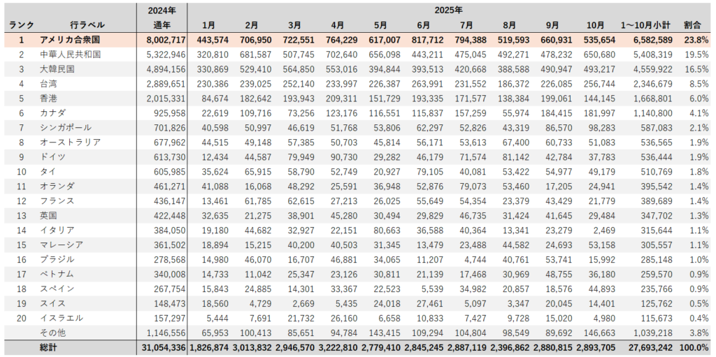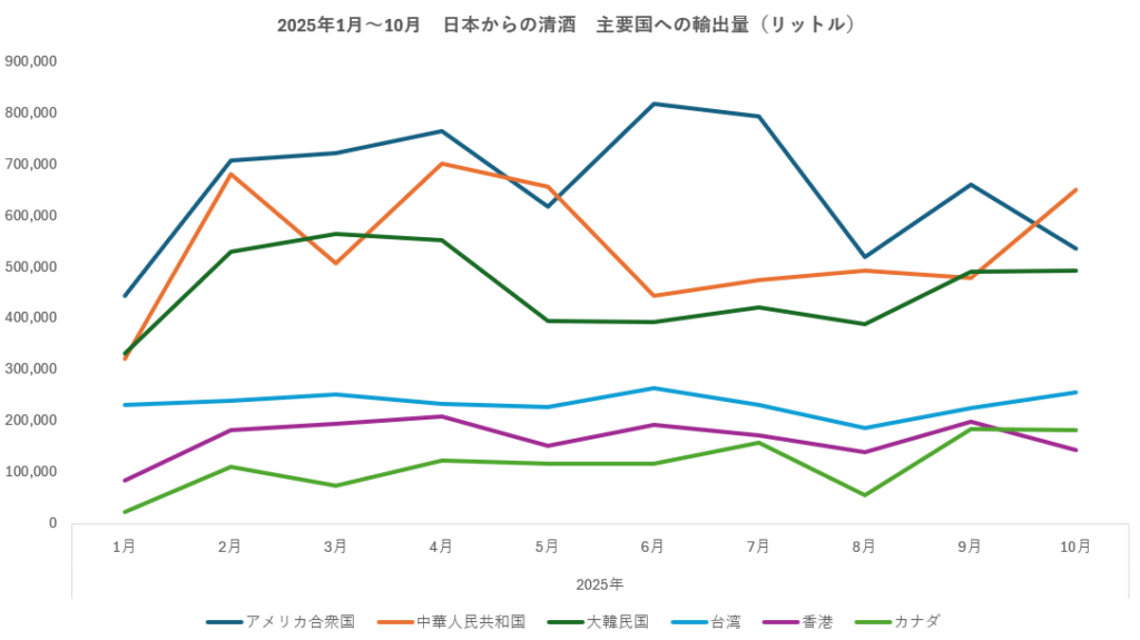 2025年1月~10月の日本からの清酒(HSコード:2206.00.200)の輸出状況をみてみた。