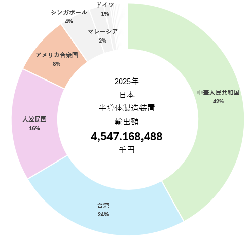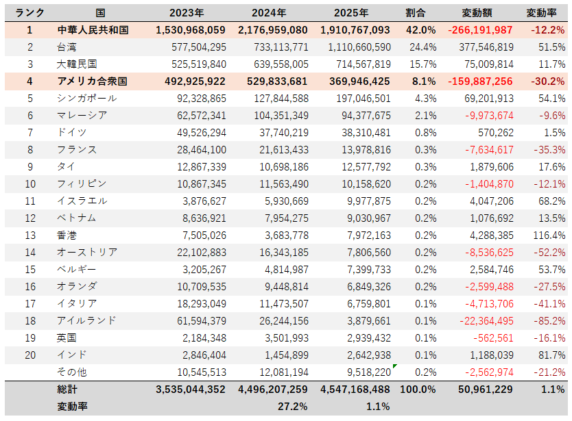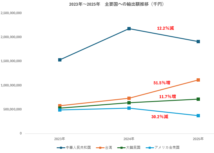 - 台湾向け輸出額:1兆1,107億円(24%)。2024年の7,331億円から3,775億円(51.5%)の大幅増加