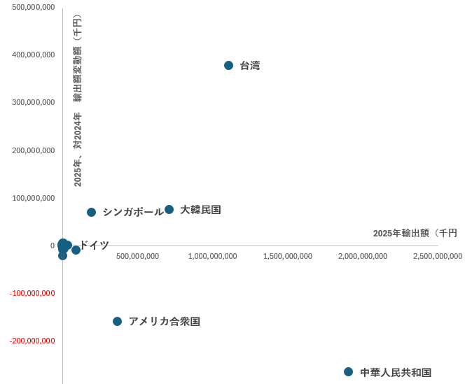 横軸に2025年輸出額(千円)、縦軸に2025年、対2024年輸出変動額(千円)をとった散布図でみると、