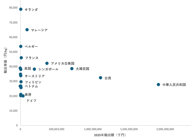 - 輸出額は小さいが単価が高いのは、オランダ、マレーシア、ベルギー向け。