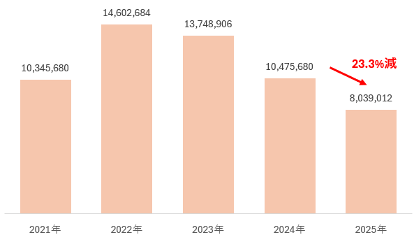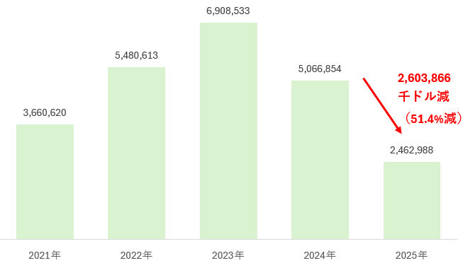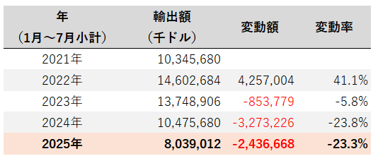 2021年~2025年の1月~7月の小計でみると、2024年から2025年同時期比で、2,436百万ドル減少(23.3%減少)しており、2022年以来輸出額は減少傾向にある。