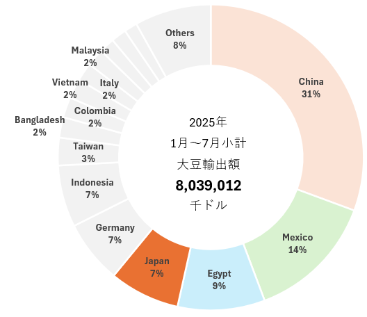 2025年1月~7月小計 アメリカからの大豆輸出額、国別割合