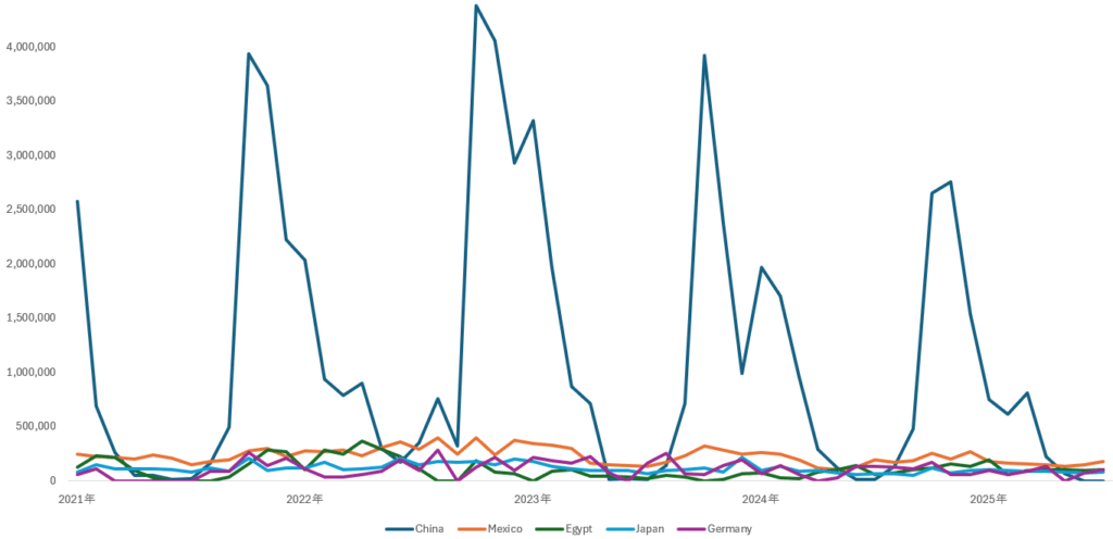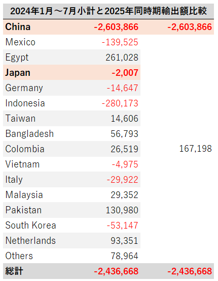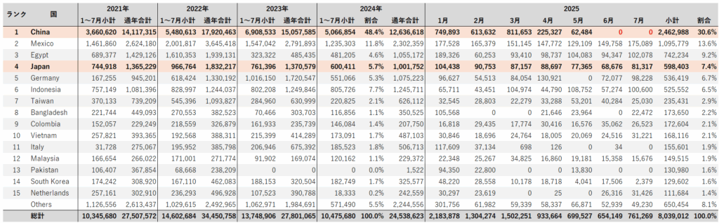 次に、2025年1月~7月小計を国別でみると、以前、中国が2,462百万ドル(31%)でトップであるが、これは、5月までの小計が大きいからで、5月、6月のように輸出額ゼロが2025年後半まで続くと、大幅に割合は減少していくと思われる。中国の次はメキシコ向け輸出の1,096百万ドル(14%)、そして、エジプト向けの742百万ドル(9%)と続く。日本向けは598 百万ドル(7%)で4位となっている。