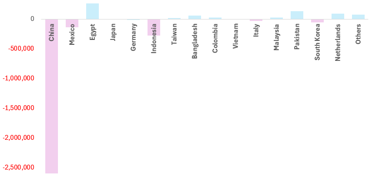 2024年1月~7月小計と2025年同時期との輸入額の差(千ドル)