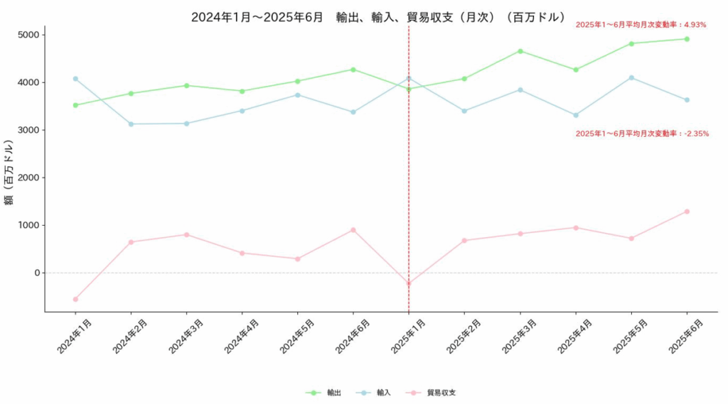 月次でみてみると、2025年1月~6月では、アメリカからブラジルへの輸出で平均4.9%増、輸入は平均2.4%減と、輸出が増加し、輸入が減少していることから、貿易黒字は2025年に入って増加していっている。