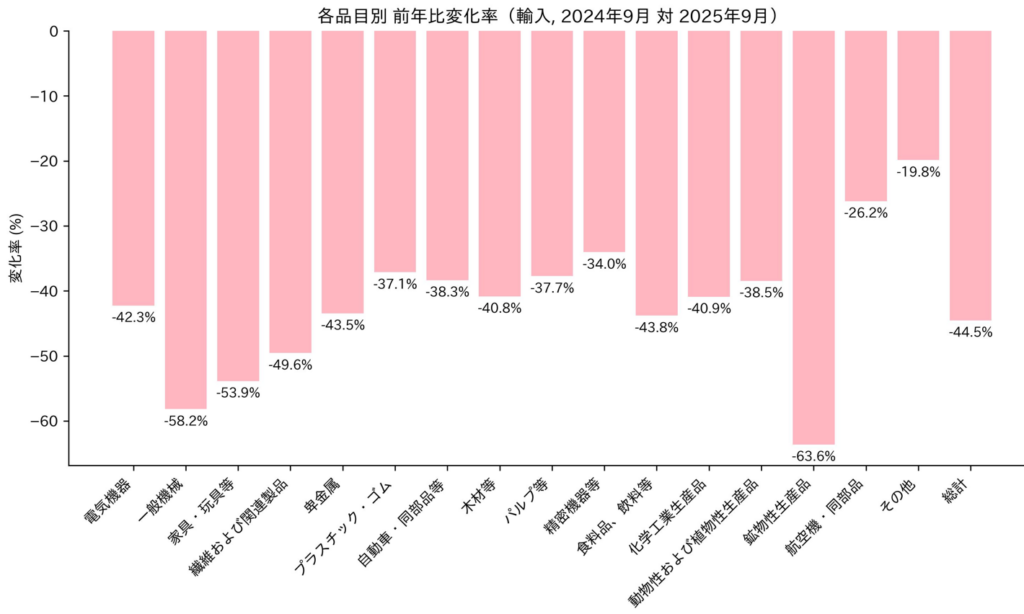 2024年通年のアメリカの中国への輸出額は1,432億ドル、輸入は4,294億ドル、貿易収支は2,862億ドルの大幅赤字。2025年9月単月では、輸出額が84億ドル(対前月比1.3%増)、輸入が233億ドル(対前月比0.2%増)、貿易収支が149億ドルの赤字(対前月比0.4%赤字減)となっている。アメリカの中国からの輸入において、9月単月では、2024年9月と比較して、総計では44.5%と劇的に減少。全ての分野で9月の輸入額は、対前年同月比で減少している。一番減少率が大きいのは、鉱物性生産品の63.6.0%減、次に、一般機械の58.2%減、そして、家具・玩具の53.9%減と続く。