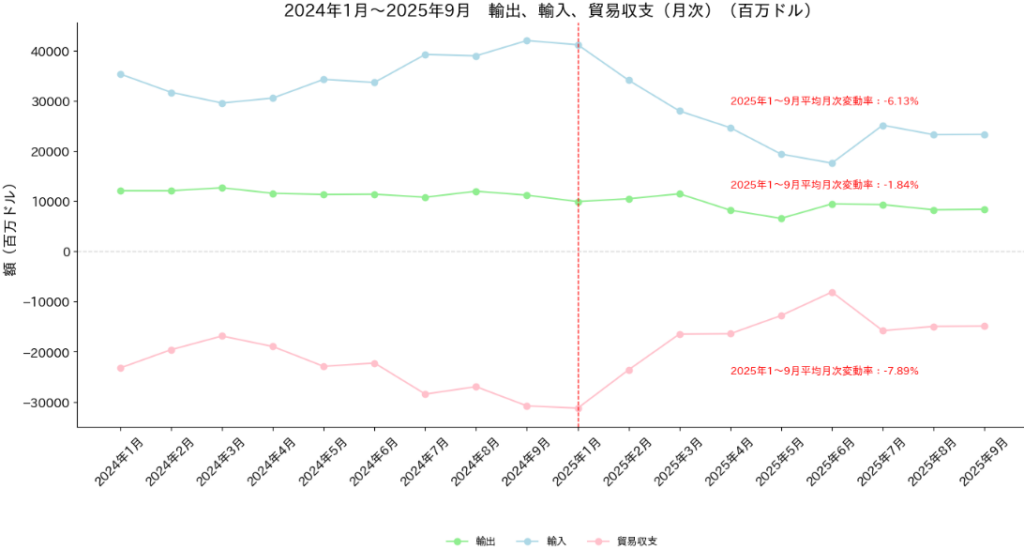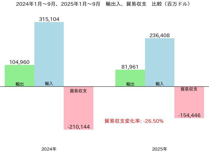 2025年1月~9月小計では、輸出額が820億ドル、輸入額が2,364億ドル、貿易収支が1,544億ドルの赤字で、赤字額は昨年同時期比で557億ドル(26.5%)と大幅に減少している。