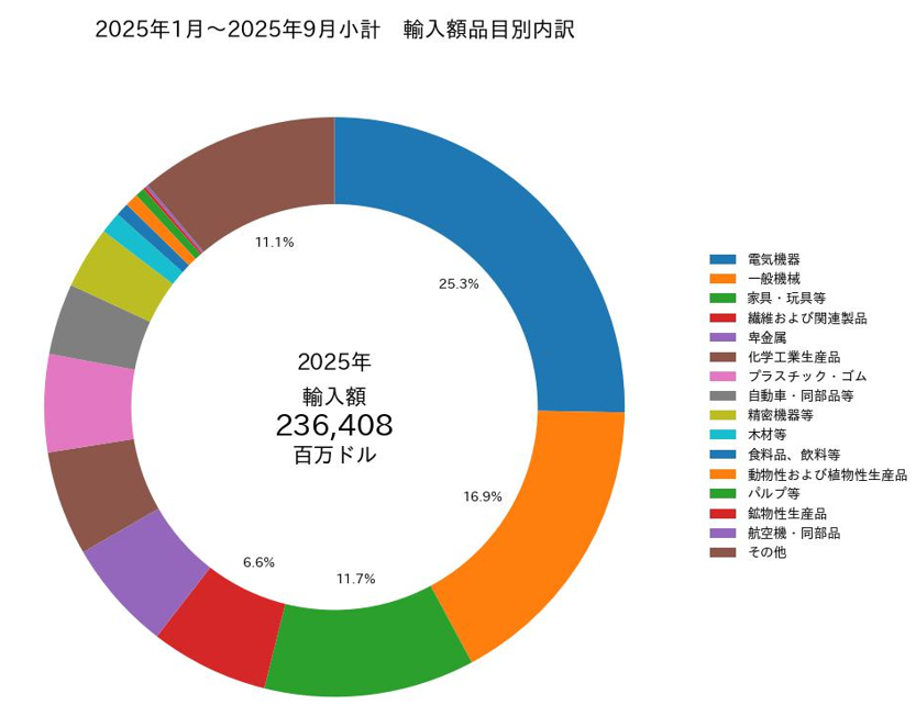アメリカの中国からの輸入を2025年(1月から9月までの小計)の品目別でみると、電気機器が598億ドル(25%)でトップ、次いで、一般機械の399億ドル(17%)、そして、家具・玩具の277億ドル(12%)となっている。
