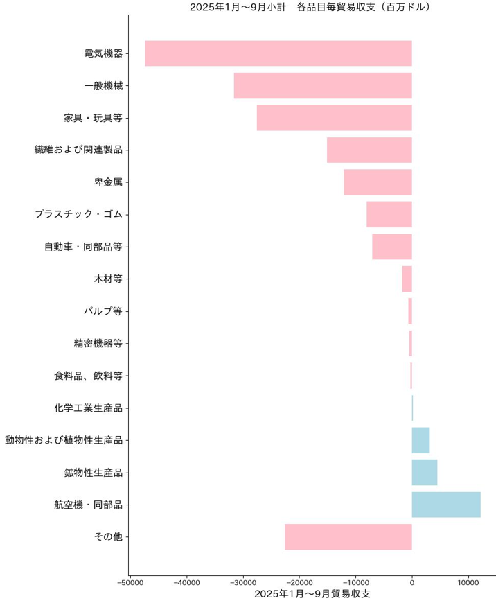 2025年1月から9月までのアメリカの中国からの輸入小計を品目別の貿易収支でみると、電気機器が474億ドルの赤字で、赤字額全体の31%を占めている。次いで、一般機械の316億ドル、そして、家具・玩具の275億ドルの赤字と続く。一方、アメリカからみて貿易黒字の分野は、化学工業生産品、動物性および植物性生産品、鉱物性生産品、航空機・部品の4品目のみとなっている。