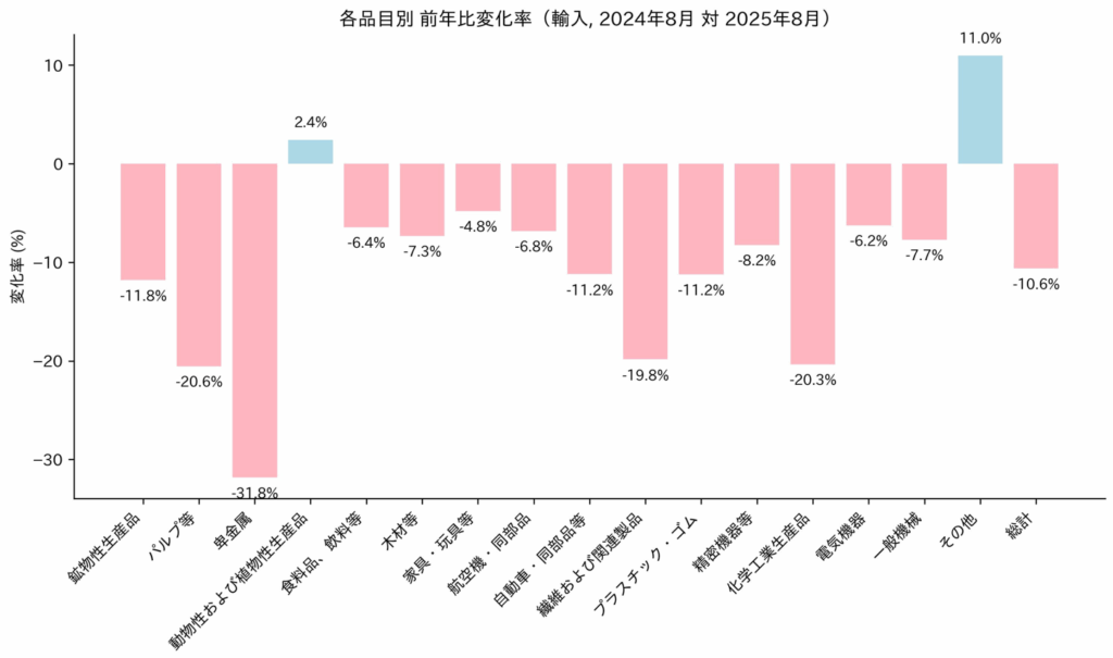 2024年通年のアメリカのカナダへの輸出額は3,499億ドル、輸入は4,117億ドル、貿易収支は618億ドルの赤字。2025年8月単月では、輸出額が272億ドル(対前月比4.2%増)、輸入が294億ドル(対前月比8.5%減)、貿易収支が22億ドルの赤字(対前月比63.6%赤字減)となっている。アメリカのカナダからの輸入において、8月単月では、2024年8月と比較して、総計では10.6%減少。一番減少率が大きいのは、卑金属の31.8%減、次に、パルプの20.6%減。増加したのは、動物性・植物性生産品とその他のみで、それ以外は、全て減少している。