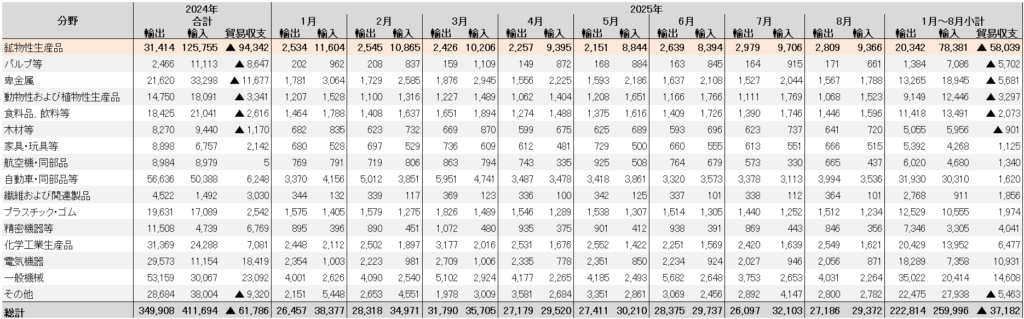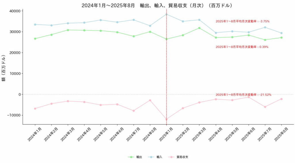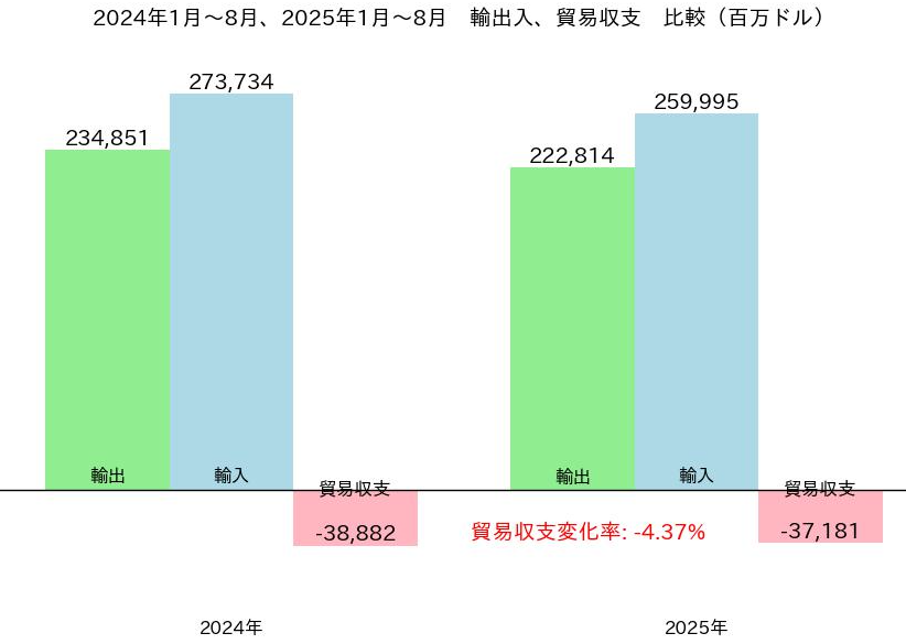 2025年1月~8月小計では、輸出額が2,228億ドル、輸入額が2,600億ドル、貿易収支が372億ドルの赤字で、赤字額は昨年同時期比で17億ドル(4.4%)減少している。
