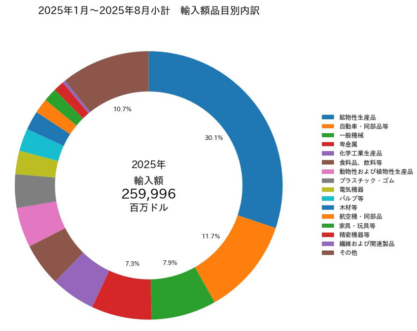 アメリカのカナダからの輸入を2025年(1月から8月までの小計)の品目別でみると、鉱物性生産品(主に原油)が784億ドル(30%)でトップ、次いで、自動車・部品の303億ドル(12%)、そして、一般機械の204億ドル(8%)となっている。