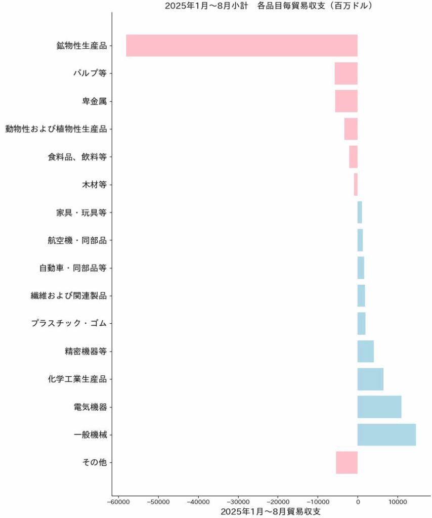 2025年1月から8月までのアメリカのカナダからの輸入小計を品目別の貿易収支でみると、鉱物性生産品(主に原油)が580億ドルの赤字で、赤字額全体の156%を占めている。次いで、パルプの57億ドル、そして、卑金属の57億ドルの赤字と続く。一方、アメリカからみて貿易黒字の分野は、家具・玩具、航空機・部品、自動車・部品、繊維、プラスチック・ゴム、精密機械、化学工業生産品、電気機器、一般機械の9品目となっている。