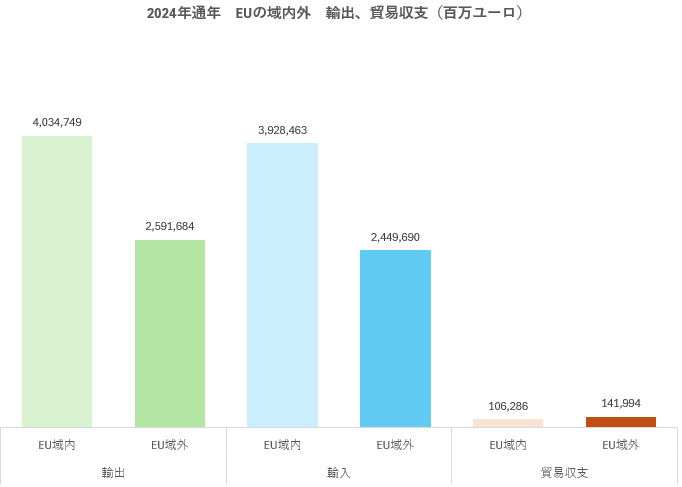 2024年通年合計のEUからの輸出額は6兆6,264億ユーロで、内訳として、域内が4兆347億ユーロ、域外が2兆5,917億ユーロ。輸入額は6兆3,782億ユーロで、内訳として、域内が3兆9,284億ユーロ、域外が2兆4,497億ユーロ。貿易収支は2,483億ユーロの黒字で、内訳として、域内が1,063億ユーロ、域外が1,420億ユーロ。大きな特徴として、輸出入とも、域内が60%、域外が40%という構造であるが、貿易収支では、域内が43%、域外が57%と域外からより多くの黒字を稼いでいる点にあるといえる。
