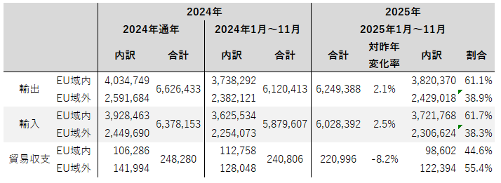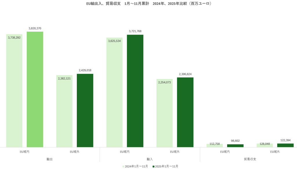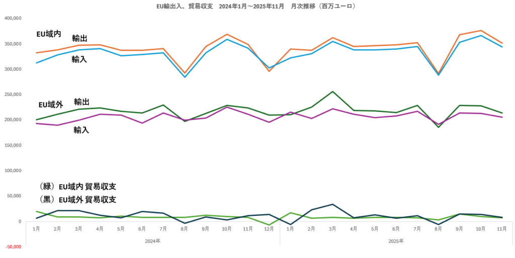 EU 域内・域外 輸出入、貿易収支 2025年~11月