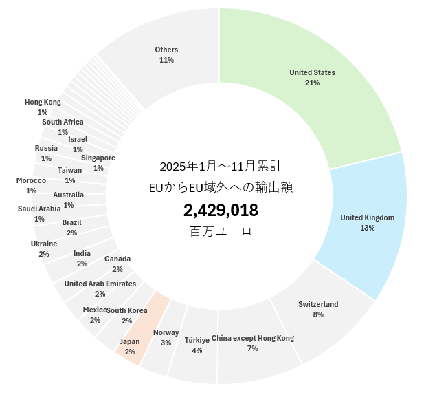2025年1月~11月累計の域外向け輸出を国別でみると、アメリカ向けが5,159億ユーロ(21%)でトップ、次に、英国向けの3,198億ユーロ(13%)、そして、スイス向けの2,018億ユーロ(8%)と続く。日本向けは604億ユーロ(2%)であった。