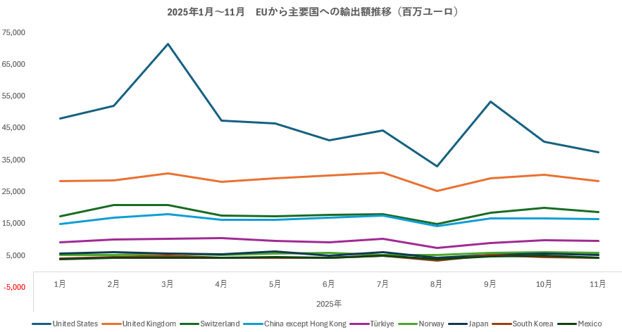 2024年、2025年1月~11月 EUからの輸出額状況(国別)(百万ユーロ)