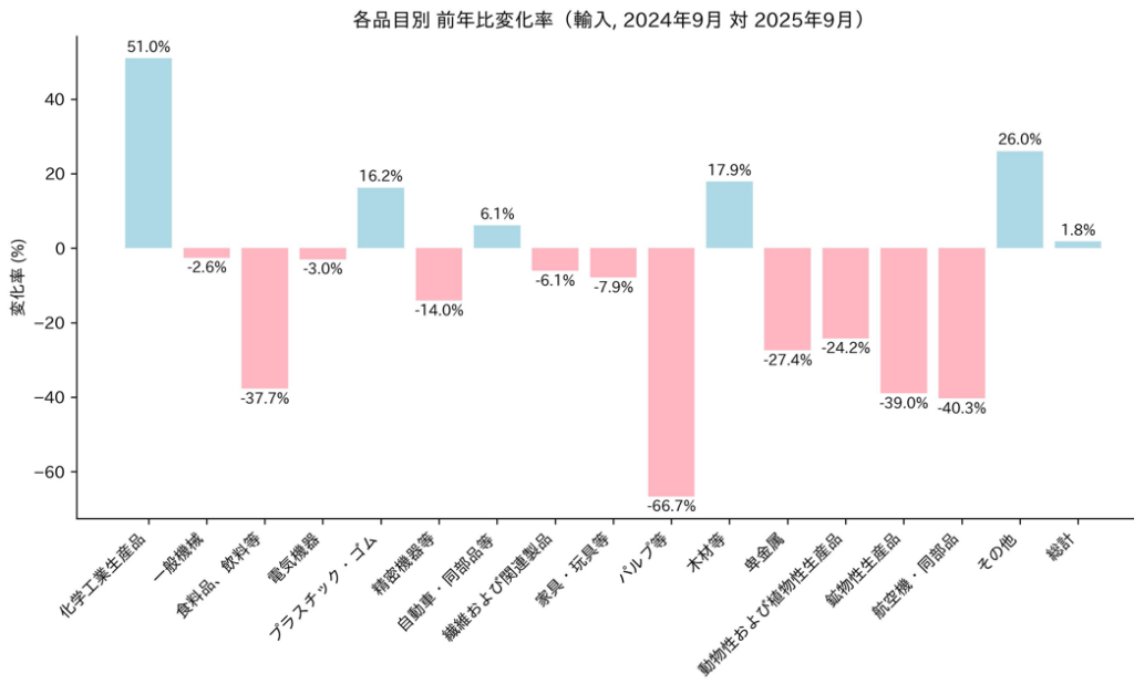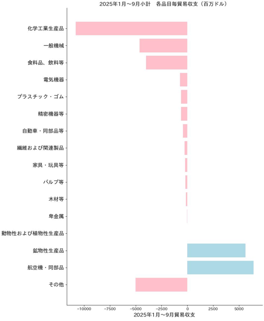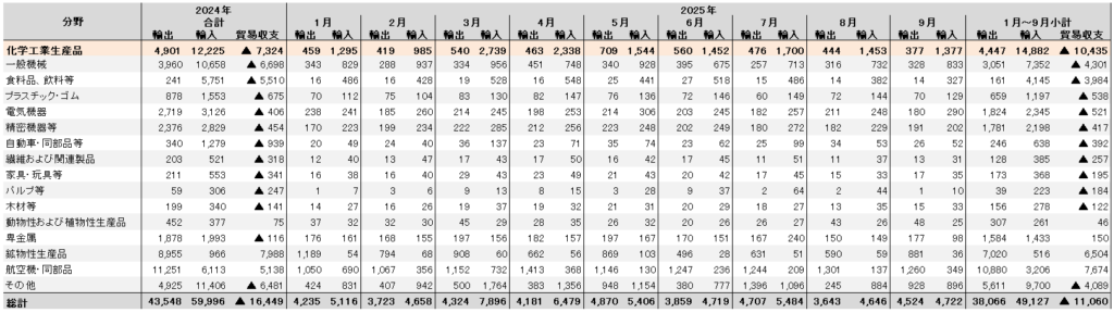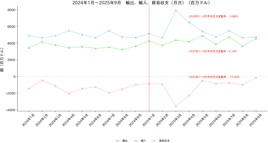 2025年1月~9月小計では、輸出額が381億ドル、輸入額が491億ドル、貿易収支が111億ドルの赤字で、赤字額は昨年同時期比で14億ドル(11.0%)減少している。