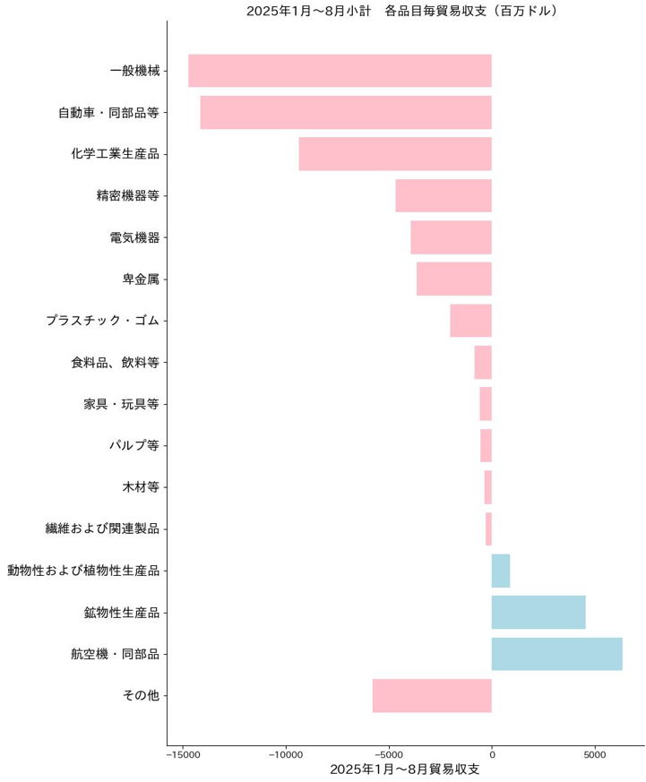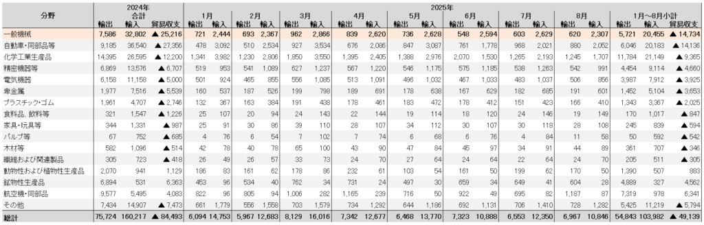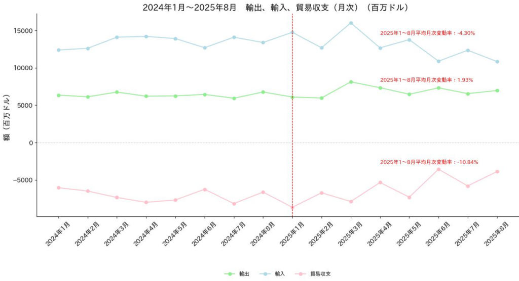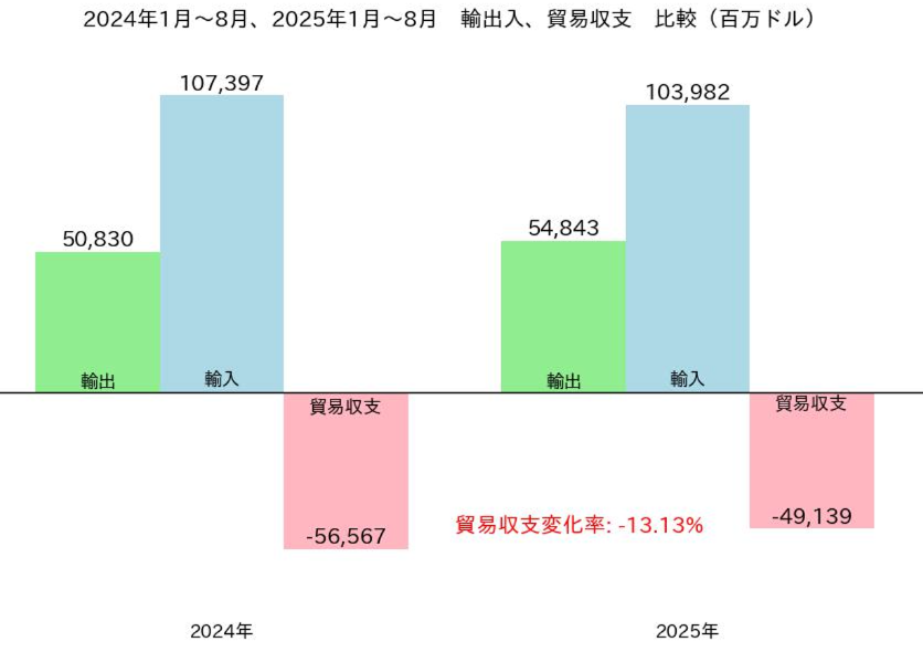 2025年1月~8月小計では、輸出額が548億ドル、輸入額が1,040億ドル、貿易収支が491億ドルの赤字で、赤字額は昨年同時期比で74億ドル(13.1%)減少している。