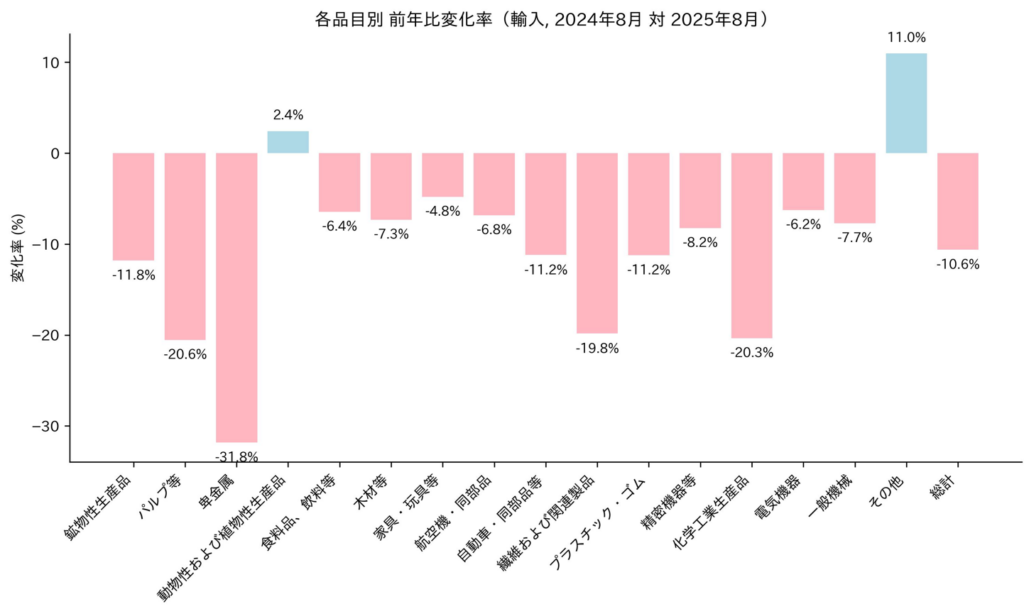 2024年通年のアメリカのドイツへの輸出額は757億ドル、輸入は1,602億ドル、貿易収支は845億ドルの赤字。2025年8月単月では、輸出額が70億ドル(対前月比6.3%増)、輸入が108億ドル(対前月比12.2%減)、貿易収支が39億ドルの赤字(対前月比33.1%赤字減)となっている。アメリカのドイツからの輸入において、8月単月では、2024年8月と比較して、総計では10.6%減少。一番減少率が大きいのは、卑金属の31.8%減、次に、パルプの20.6%減。そして、化学工業生産品の20.3%減となっている。上昇したのは、動物性・植物性生産品、その他の2品目のみ。