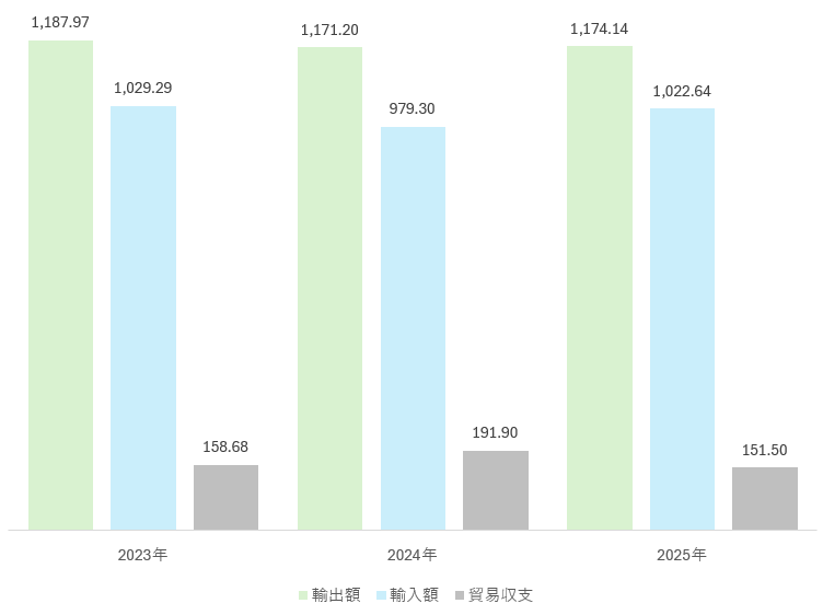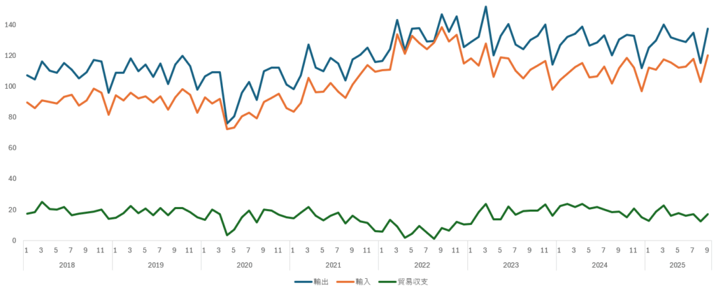 1月~9月小計を2023年、2024年、2025年でみると、輸出では、2024年から2025年比較で0.3%増、輸入で4.4%増、貿易収支は21.1%の減となっている。