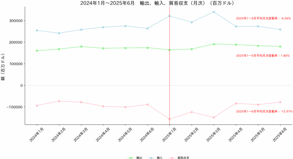 月次でみてみると、2025年前期(1月~6月)では、アメリカから全ての国への輸出で平均1.9%増、輸入は平均4.3%減と、輸入が減少したこともあり、貿易赤字は平均で13.0%減と、大幅に減少している。