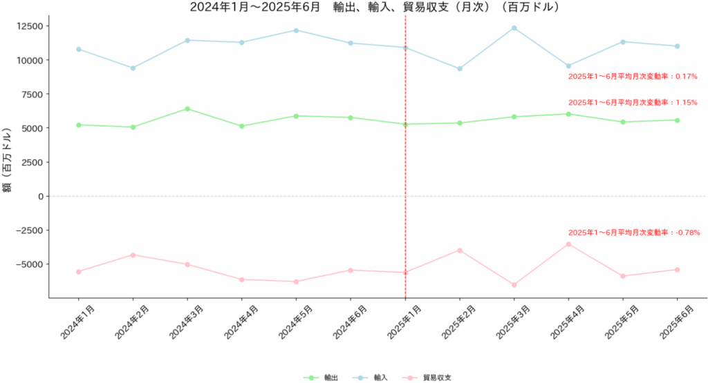 月次でみてみると、2025年1月~6月では、アメリカから韓国への輸出で平均1.2%増、輸入は平均0.2%増と、輸出入とも微増しており、貿易赤字は平均で0.8%と若干減少している。