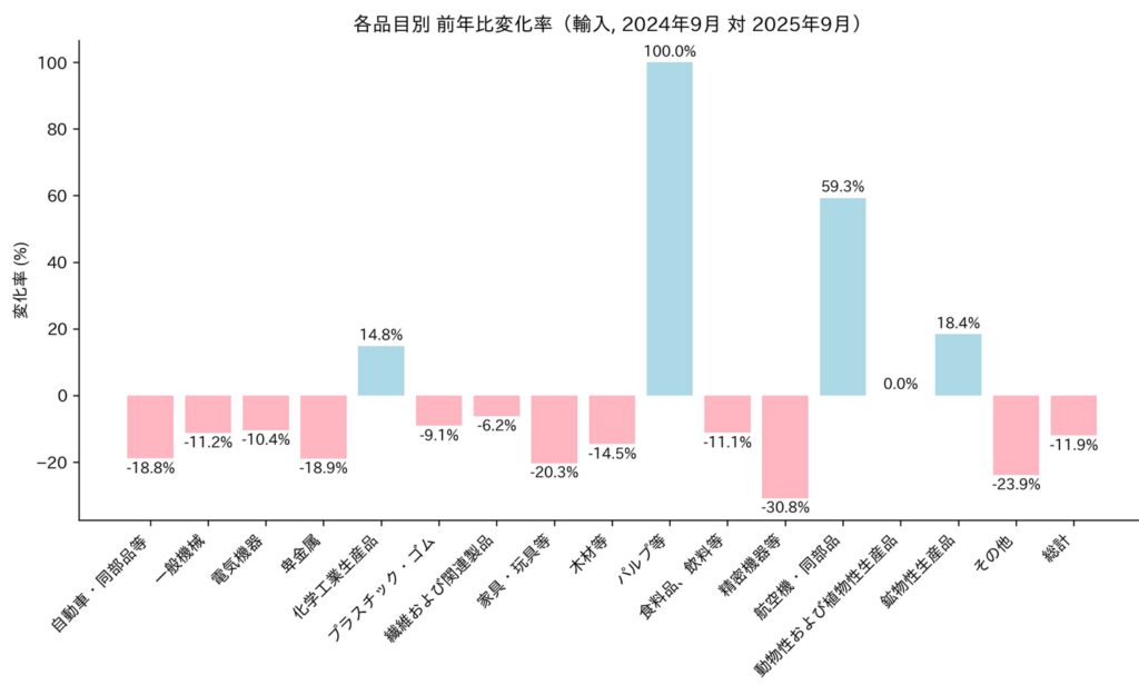 2024年通年のアメリカの韓国への輸出額は656億ドル、輸入は1,305億ドル、貿易収支は649億ドルの赤字。2025年9月単月では、輸出額が61億ドル(対前月比5.8%増)、輸入が97億ドル(対前月比3.0%減)、貿易収支が42億ドルの赤字(対前月比12.5%赤字減)となっている。アメリカの韓国からの輸入において、9月単月では、2024年9月と比較して、総計では11.9%減少。一番減少率が大きいのは、精密機器の30.8%減、次に、家具・玩具の20.3%減。そして、卑金属の18.9%減となっている。上昇したのは、化学工業生産品、パルプ、航空機・部品、鉱物性生産品の4品目。