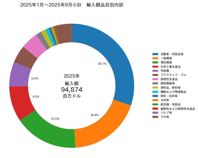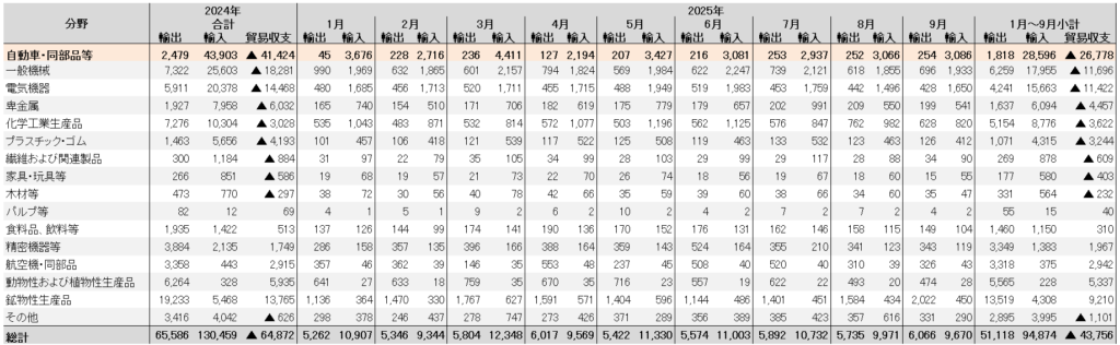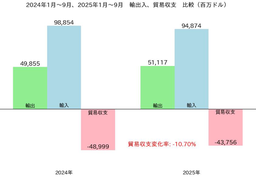 2025年1月~9月小計では、輸出額が511億ドル、輸入額が949億ドル、貿易収支が438億ドルの赤字で、赤字額は昨年同時期比で52億ドル(10.7%)減少している。