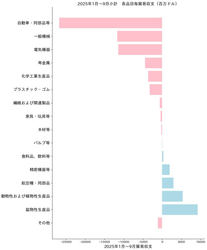 2025年1月から9月までのアメリカの韓国からの輸入小計を品目別の貿易収支でみると、自動車・部品が268億ドルの赤字で、赤字額全体の61%を占めている。次いで、一般機械の117億ドル、そして、電気機器の114億ドルの赤字と続く。一方、アメリカからみて貿易黒字の分野は、パルプ、食料品・飲料、精密機械、航空機・部品、動物性・植物性生産品、鉱物性生産品の6品目となっている。