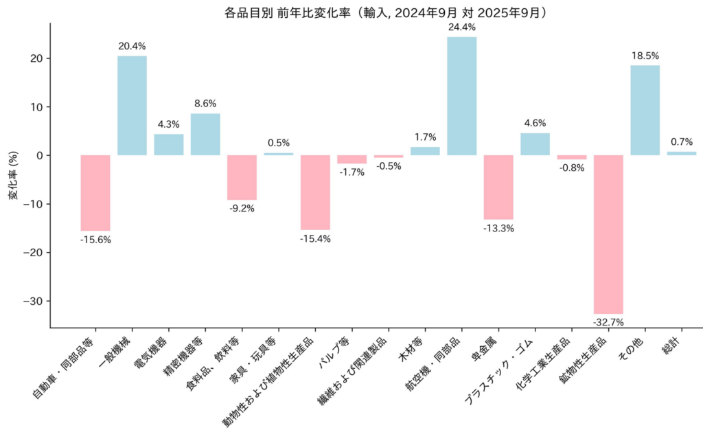 2024年通年のアメリカのメキシコへの輸出額は3,340億ドル、輸入は5,034億ドル、貿易収支は1,694億ドルの大幅赤字。2025年9月単月では、輸出額が272億ドル(対前月比7.0%減)、輸入が443億ドル(対前月比1.5%減)、貿易収支が171億ドルの赤字(対前月比8.7%赤字増)となっている。アメリカのメキシコからの輸入において、9月単月では、2024年9月と比較して、総計では0.7%増加。一番増加率が大きいのは、航空機・部品の24.4%増、次に、一般機械の20.4%増。一番減少率が大きいのは、鉱物性生産品の32.7%減、そして、自動車・部品の15.6%となっている。