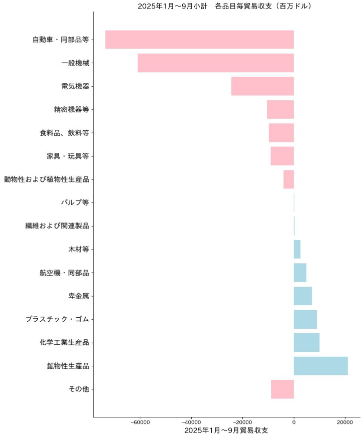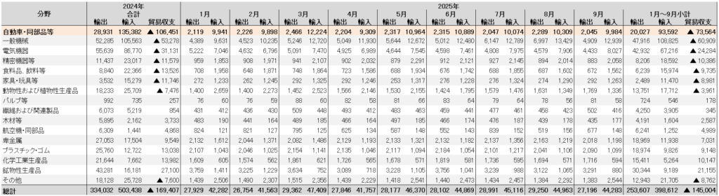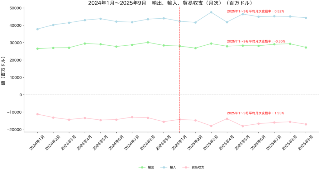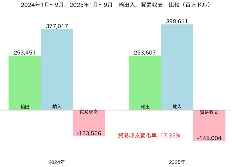 2025年1月~9月小計では、輸出額が2,536億ドル、輸入額が3,986億ドル、貿易収支が1,450億ドルの赤字で、赤字額は昨年同時期比で214億ドル(17.4%)増加している。