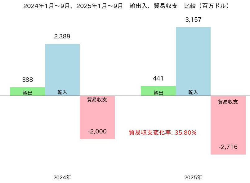 2024年通年のアメリカのロシアへの輸出額は5億ドル、輸入は29億ドル、貿易収支は24億ドルの赤字。2025年1月~9月の小計では、輸出額が4億ドル、輸入が32億ドル、貿易収支が27億ドルの赤字となっている。2024年同時期との比較では、輸入が32%増加、それに伴い、貿易赤字が、35.8%増加している。