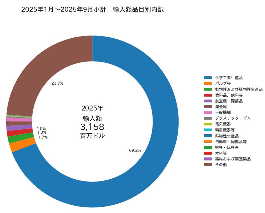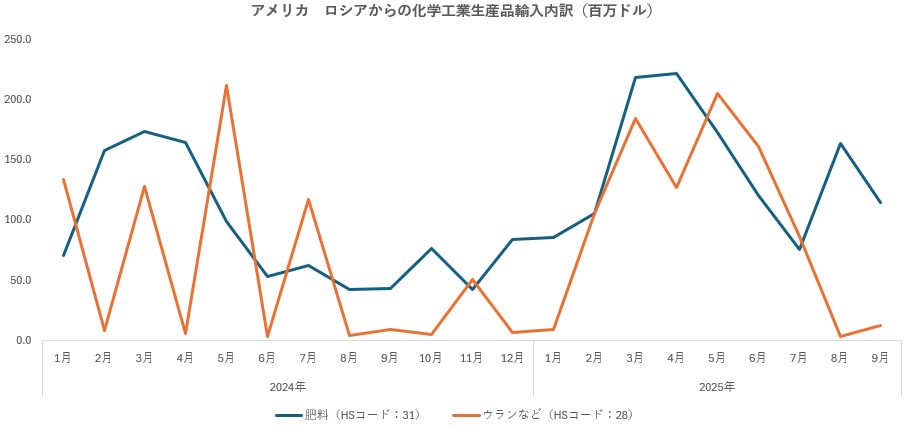 アメリカのロシアからの輸入を2025年1月~9月の品目別でみると、化学工業生産品が22億ドル(69%)でほぼ全てと言える状況。これらは具体的には、ウラン(HSコード:2844)、窒素肥料(HSコード:3102)、カリ肥料(HSコード:3104)などであり、特にウランは、2025年に入り急激に輸入が増加していたが、6月以降、一気に減少している。