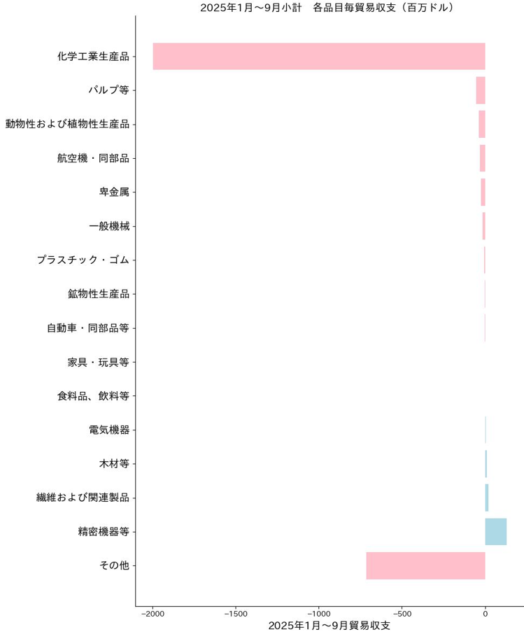 2025年1月から9月までのアメリカのロシアからの輸入小計を品目別の貿易収支でみると、化学工業生産品(肥料、ウランなど)が20億ドルの赤字で、赤字額全体の74%を占めている。それ以外は、ほぼゼロと言える状況。一方、アメリカからの輸出もほぼゼロの状況。