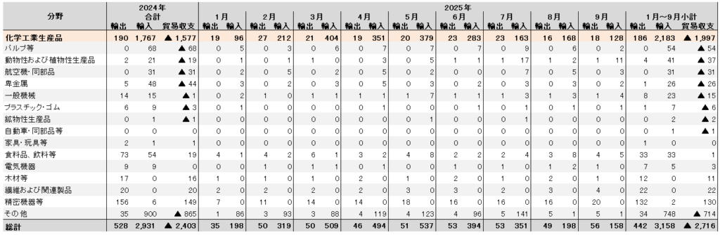 アメリカ ロシアとの輸出入、貿易収支(分野別) 2025年~9月