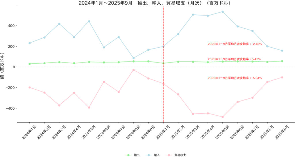月次でみてみると、2025年1月~9月では、アメリカからロシアへの輸出で月平均5.4%増、輸入は2月~5月増加したが、それ以降減少していることもあり、月平均2.5%減貿易赤字は月平均で5.0%減となっている。